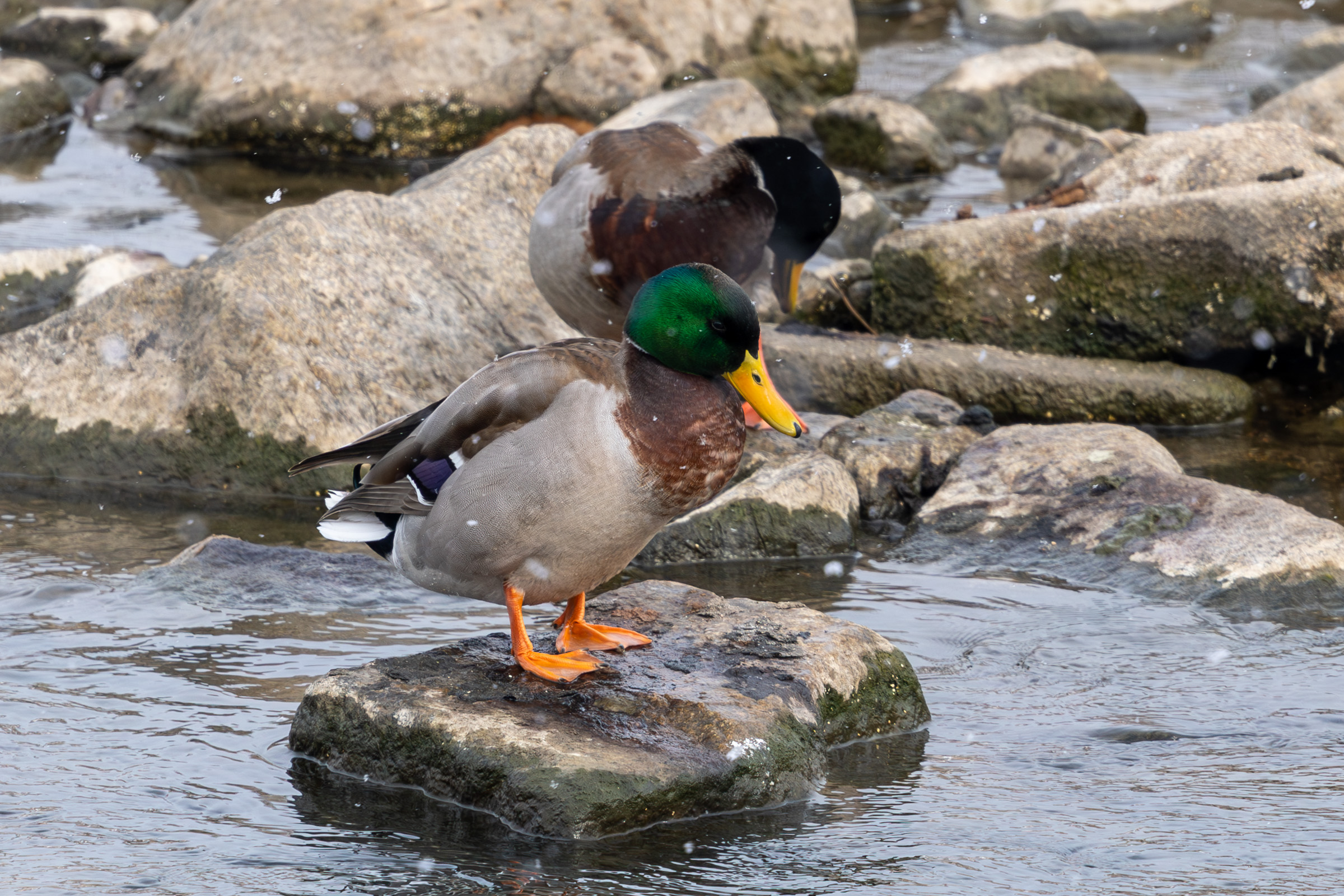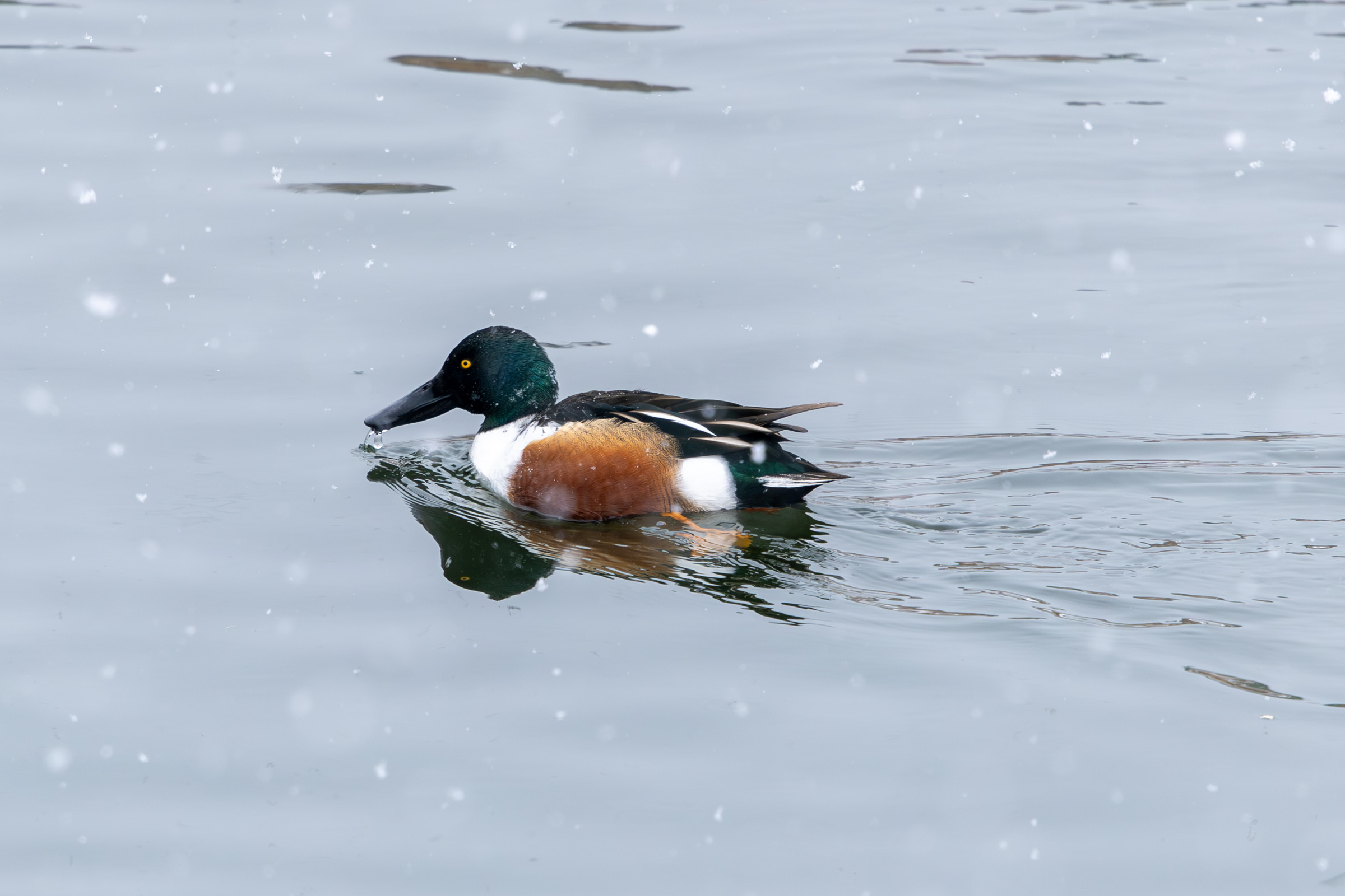 눈이 생각보다 많이 왔다. 그래도 오리들은 그 찬물에 목욕하고 난리 남.