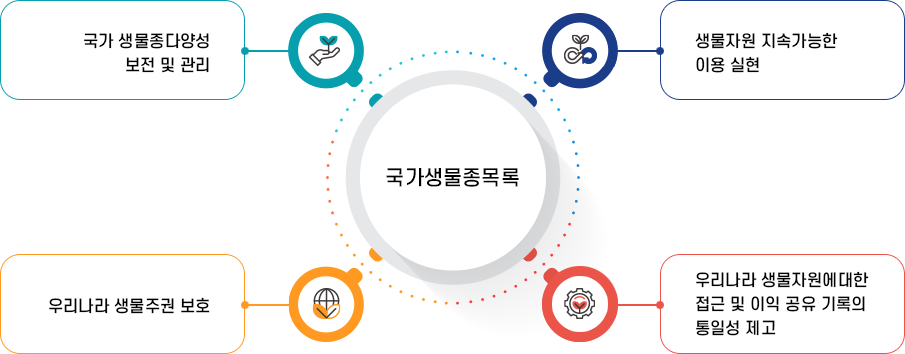 국가생물종목록은 우리나라가 관리하고 있거나 관리가 필요한 모든 생물종을 대상으로 합니다. 기관, 학계, 그리고 일반사용자들이 혼동하여 사용하고 있는 각 생물종의 학명(정명, 동종이명),