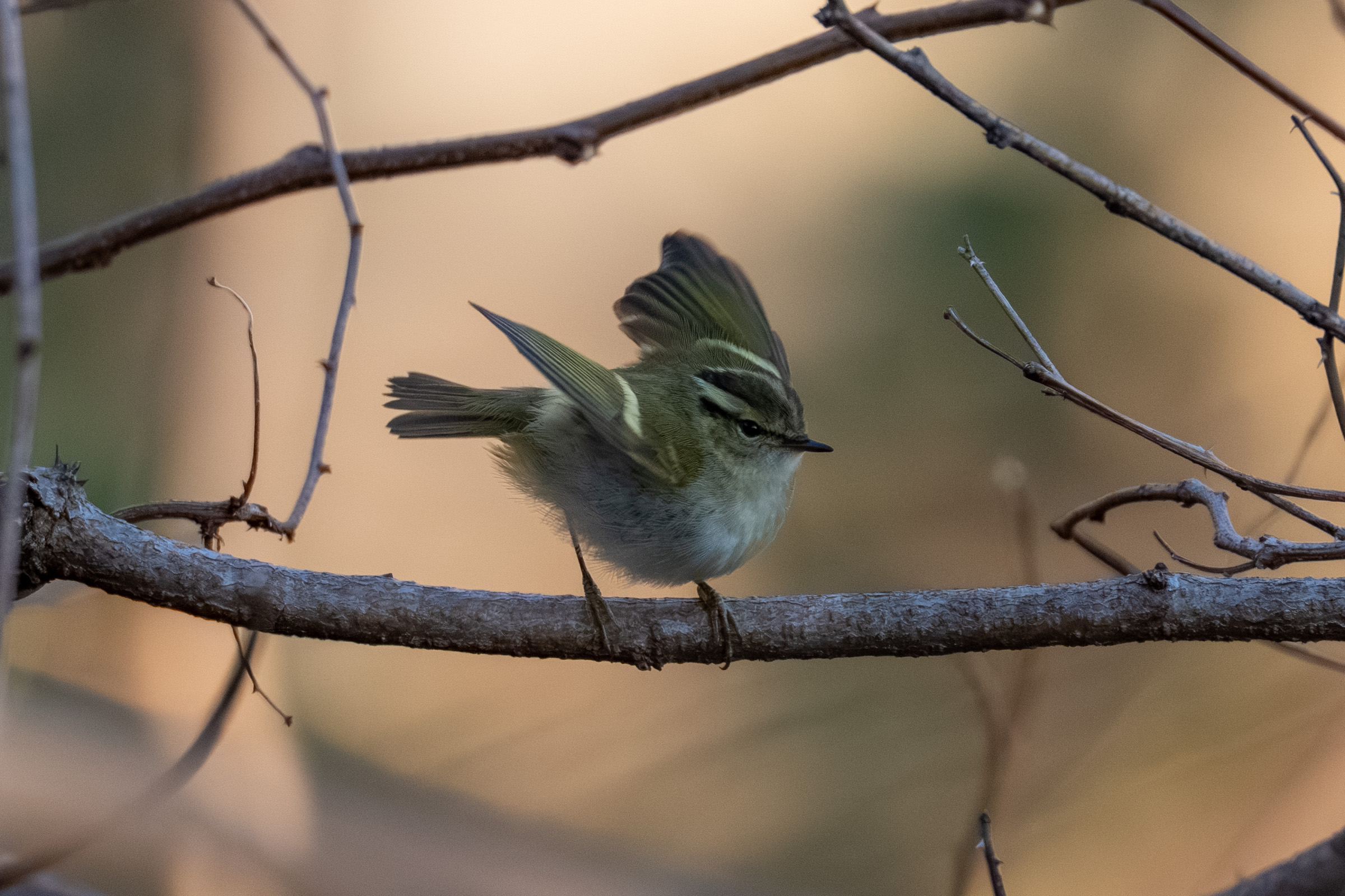 날개선 뒤쪽에 어두운 반점이 있다면 노랑눈썹솔새 아니면 노랑허리솔새.